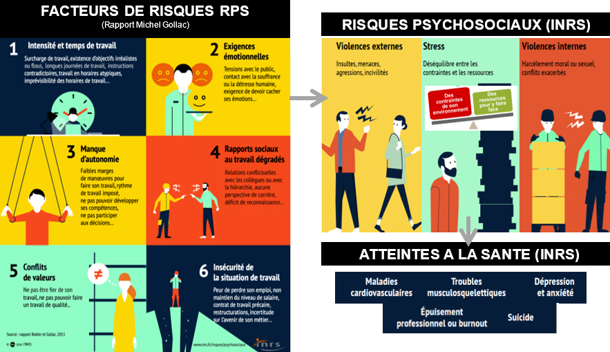 Les risques psychosociaux « recouvrent en réalité des risques professionnels d’origine et de nature variées, qui mettent en jeu l’intégrité physique et la santé mentale des salariés et ont, par conséquent, un impact sur le bon fonctionnement des entreprises. On les appelle « psychosociaux » car ils sont à l’interface de l’individu et de sa situation de travail » – Source : Ministère du Travail